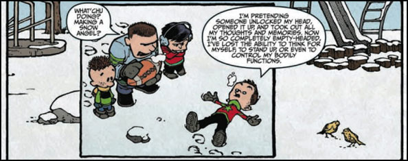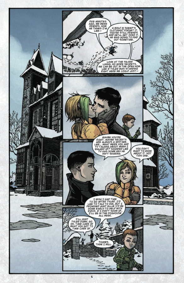 «Sparrow«, el número aquí ofrecido, es una historia especial, pues cuenta la historia desde el punto de vista del pequeño Bode, un niño que ha visto demasiado y cuyas experiencias le dificultan el hacer amigos. Al descubrir una llave especial, al mismo tiempo que enfrenta una nueva amenaza del misterioso enemigo que sabemos es Zack, las cosas cambiarán su perspectiva en 360 grados, tocando su corazón. Una pequeña gran historia que no tiene desperdicio, no sólo por la opción de homenajear al gran Bill Waterson, sino por la inteligencia con la que está compuesta, y que ayuda a generar distintos niveles de significado. La opción de imitar el registro gráfico del creador de Calvin y Hobbes no es gratuita, pues además de probar el magnífico oficio de Rodríguez, se trata de un reconocimiento al autor que mejor ha plasmado las potencialidades de la imaginación infantil. Con la sola excepción de Charles Schultz (Peanuts), Waterson es el autor que mejor ha mapeado el complejo mapa de emociones, ilusiones y sentimientos que nos inundan a los diez años. Y el final, ciertamente, es edificante. No hay vergüenza en reconocerse en ese precioso momento.