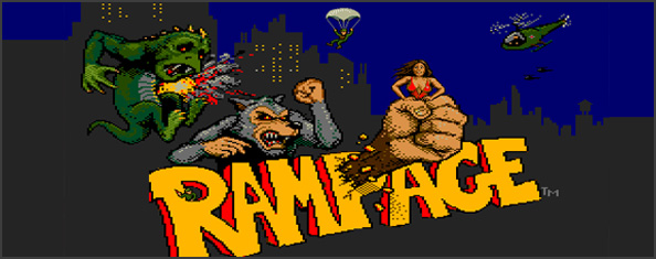 Rampage, que tuvo múltiples versiones en consolas, e incluso volvió con secuelas a partir del primer Playstation y Nintendo 64, pone a una ciudad en riesgo con gigantes criaturas destructivas que echan abajo edificios, se alimentan de los pobres condenados durante su frenesí y destruyen las fuerzas militares que intentan poner a tajo la situación. Claro que el abanico de personajes no es muy original, ya que cuenta con un simio gigante (George), un lagarto tipo Godzilla que debe ser mala onda sólo por su nombre (Lizzie) y hasta un pseudo hombre lobo (Ralph).