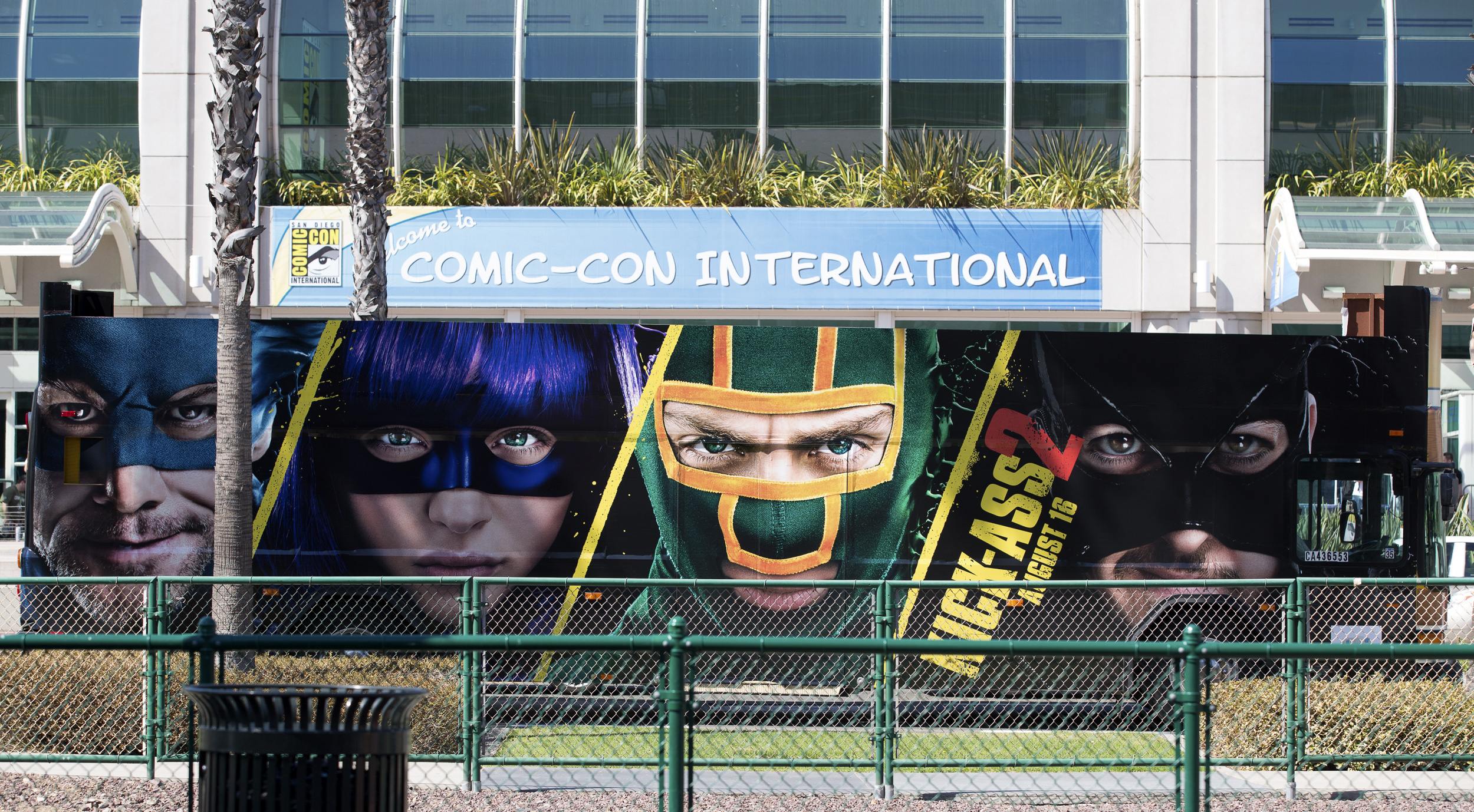 A bus with an advertisement for the movie «Kick-Ass 2» drives past the San Diego Convention Center a day before the start of the 2013 Comic-Con in San Diego, California July 17, 2013. Once a hotbed for avid fans of cult comic and fantasy genres, San Diego’s Comic-Con has become an important stop for film studios and directors looking to gauge the responses of the convention’s savvy audience. REUTERS/Fred Greaves (UNITED STATES – Tags: ENTERTAINMENT SOCIETY) COMICCON-FILM