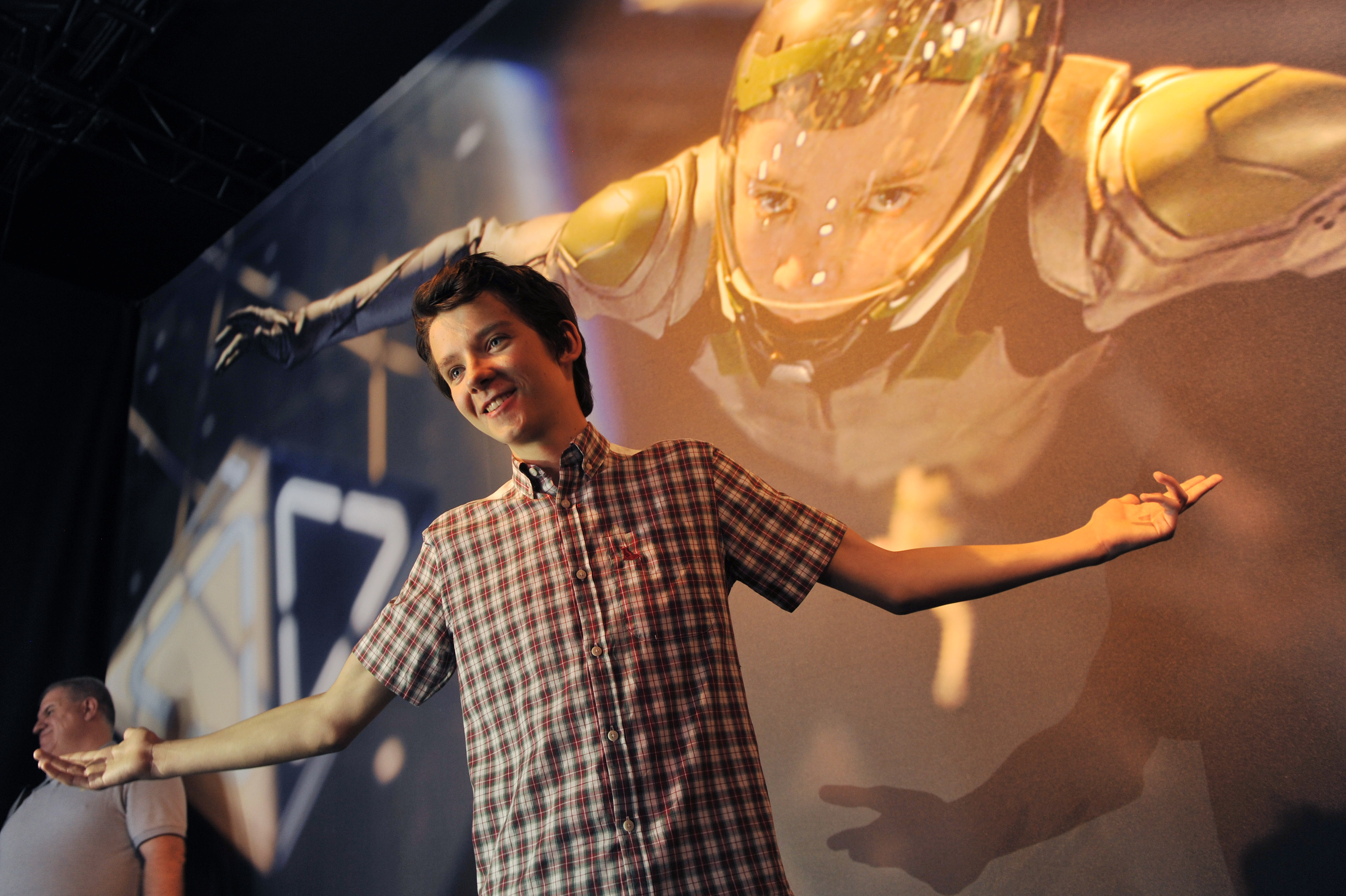 Asa Butterfield, a cast member in the forthcoming film «Ender’s Game,» poses underneath a picture of his character in the film at a preview event for the film at the 2013 Comic-Con International Convention on Wednesday, July 17, 2013 in San Diego, Calif. (Photo by Chris Pizzello/Invision/AP) 2013 Comic-Con – Ender’s Game Preview Event