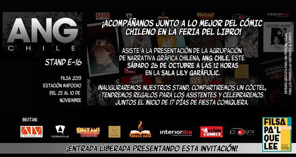 Este sábado 26 de octubre, como parte de las primeras jornadas de la Feria Internacional del Libro de Santiago, se llevará a cabo la presentación de la Agrupación de Narrativa Gráfica Chilena (ANG). Un evento en el que no solo inaugurarán sus stands de merca en la Estación Mapocho, sino que además las editoriales y empresas involucradas en el proyecto darán cuenta del escenario actual del cómic en Chile y sus objetivos de dominación mundial. Todo esto en una actividad que se desarrollará al mediodía en la sala Lily Garáfulic.